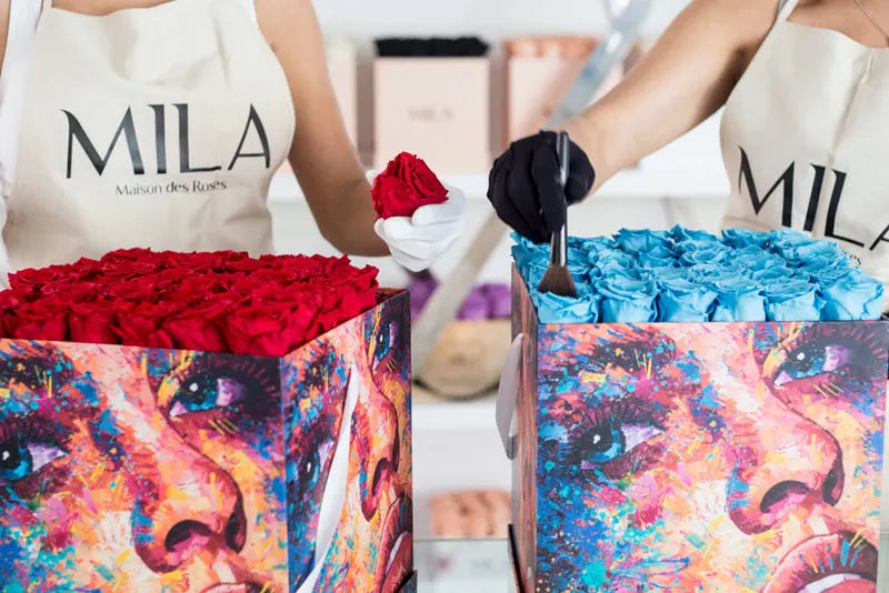 Grâce à des procédures et processus innovants, MILA Maison des Roses développe des arrangements précieux, qui maintiennent la fraîcheur d'un à trois ans. Nos ‘Collections’ sont composées uniquement de véritables roses équatoriennes et sont disponibles dans plus de 26 couleurs différentes. Les roses commencent leur vie en Équateur où elles sont cultivées avec soin pour produire une floraison complète et exceptionnellement belle. À partir de là, elles sont traitées avec une solution brevetée qui arrête la croissance de la rose dans son état le plus parfait et ont une pigmentation de couleur qui leur confère une couleur parfaite et brillante. La durée de vie de ces roses peut aller au-delà d'un an si elles sont prises en charge correctement.